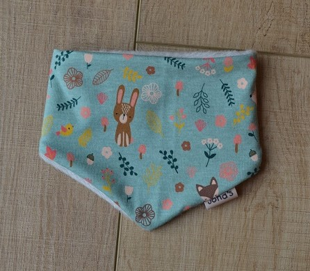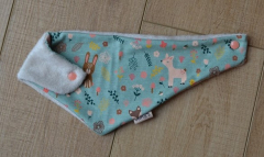 Das Halstuch Reh ist doppellagig genäht aus weichem Baumwolljersey mit einer Innenseite aus Alpenfleece der aus 95% Baumwolle und 5% Elasthan besteht. Das Halstuch hat einen Druckknopfverschluss. Es ist geeignet für Kinder von ca. 0 - 6 Monaten.