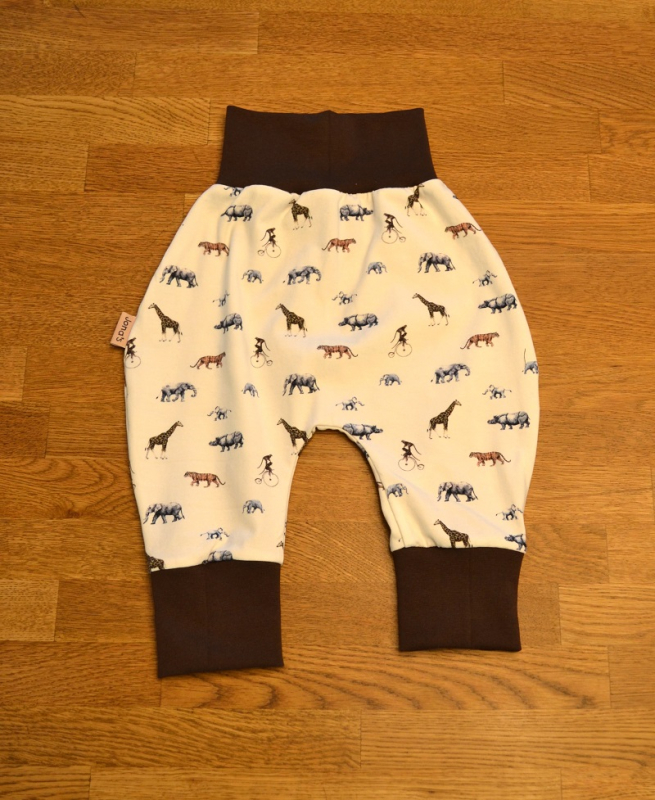 Die Pumphose Tiere braun in Größe 62/68 ist aus hochwertigem Baumwolljersey, am Bund und am Beinabschluß mit Bündchen versehen. Die verarbeiteten Stoffe sind zertifiziert nach Öko-Tex Standard 100. Der Baumwolljersey ist weich und elastisch ebenso wie der Bündchenstoff der sich auseinander ziehen lässt und dann wieder in seine Ursprungsform zurück geht. Beide Stoffqualitäten setzten sich aus 95% Baumwolle und 5% Elasthan zusammen. Alle Nähe sind mit einem speziellen Jerseystich versehen, so dass die Dehnbarkeit der Stoffe nicht beeinträchtigt wird. Waschbar ist die Mitwachshose bei 40 Grad und sollte schonend getrocknet werden.