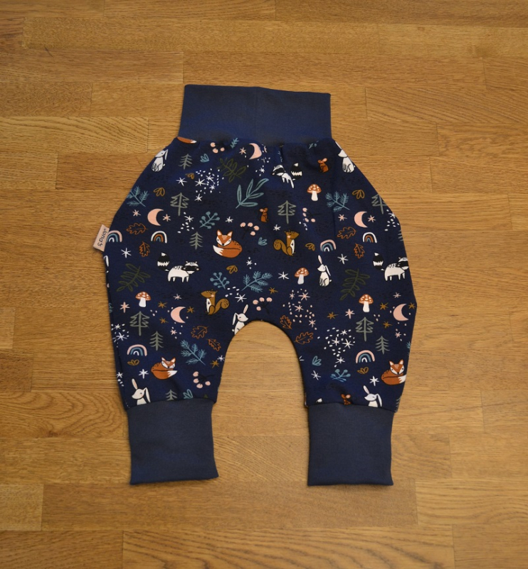 Die Pumphose Wald blau in Größe 62/68 ist aus hochwertigem Baumwolljersey, am Bund und am Beinabschluß mit Bündchen versehen. Die verarbeiteten Stoffe sind zertifiziert nach Öko-Tex Standard 100. Der Baumwolljersey ist weich und elastisch ebenso wie der Bündchenstoff der sich auseinander ziehen lässt und dann wieder in seine Ursprungsform zurück geht. Beide Stoffqualitäten setzten sich aus 95% Baumwolle und 5% Elasthan zusammen. Alle Nähe sind mit einem speziellen Jerseystich versehen, so dass die Dehnbarkeit der Stoffe nicht beeinträchtigt wird. Waschbar ist die Mitwachshose bei 40 Grad und sollte schonend getrocknet werden.