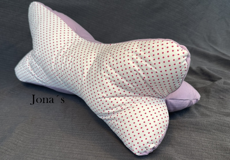 Der Leseknochen / Relaxknochen Lila Punkte ist aus Baumwollstoff genäht und mit Stopfwolle gefüllt.