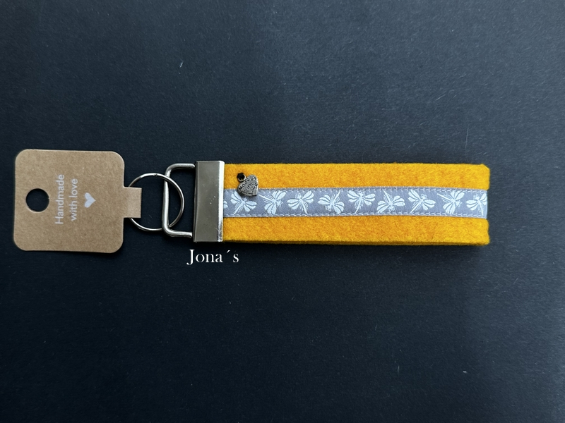 Der Schlüsselanhänger Libelle orange ist aus stabilem Filz mit aufgenähtem Webband.
