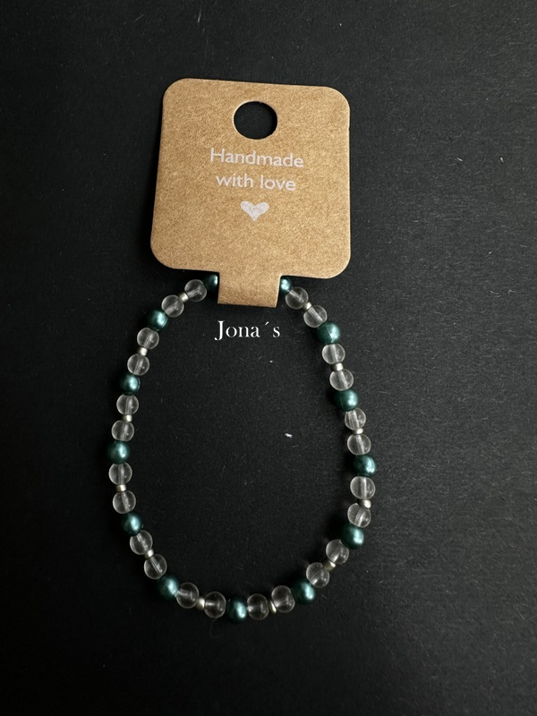 Das Armband grün-weiß ist auf einem Gummiband gefädelt für ein einfaches an- und ausziehen.