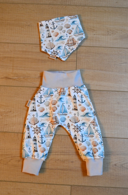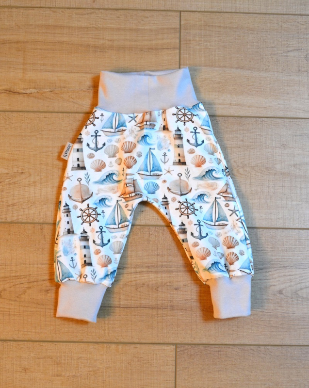 Die Mitwachshose Seefahrt in Größe 62/68 ist aus hochwertigem Baumwolljersey, am Bund und am Beinabschluß mit Bündchen versehen. Die verarbeiteten Stoffe sind zertifiziert nach Öko-Tex Standard 100. Der Baumwolljersey ist weich und elastisch ebenso wie der Bündchenstoff der sich auseinander ziehen lässt und dann wieder in seine Ursprungsform zurück geht. Beide Stoffqualitäten setzten sich aus 95% Baumwolle und 5% Elasthan zusammen. Alle Nähe sind mit einem speziellen Jerseystich versehen, so dass die Dehnbarkeit der Stoffe nicht beeinträchtigt wird. Waschbar ist die Mitwachshose bei 40 Grad und sollte schonend getrocknet werden.
