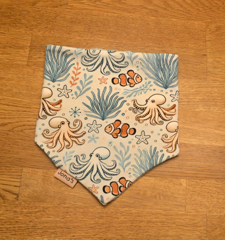 Das Halstuch Krake ist doppellagig genäht aus weichem Baumwolljersey aus 95% Baumwolle und 5% Elasthan.