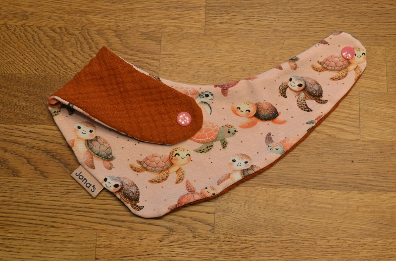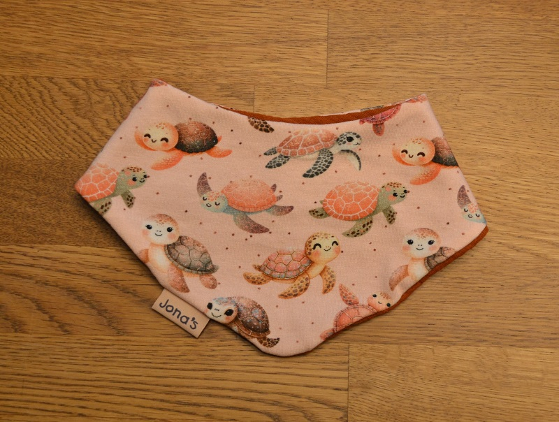 Das Halstuch Schildkröte ist doppellagig genäht aus weichem Baumwolljersey aus 95% Baumwolle und 5% Elasthan.